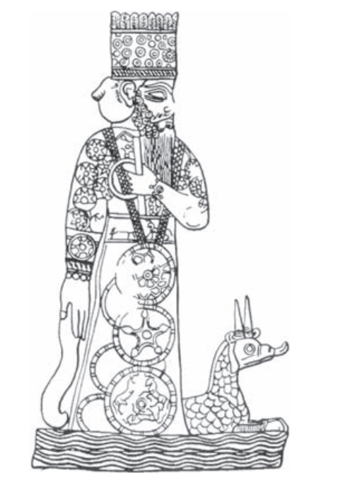 شكل 1: الإله البابلي مردوخ. يُنسب إلى مردوخ فضل فرض النظام الكوني بعد أن دمر تيامات؛ التي تجسد الفوضى البدائية، والتي تظهر في الشكل عند قدميه على صورة تنين ذي قرنين. أساطير عديدة حول العالم تتضمَّن فكرة نشوء النظام من رحم الفوضى، ويظل هذا المفهوم حاضرًا في بعض الدراسات الكونية العلمية الحديثة.