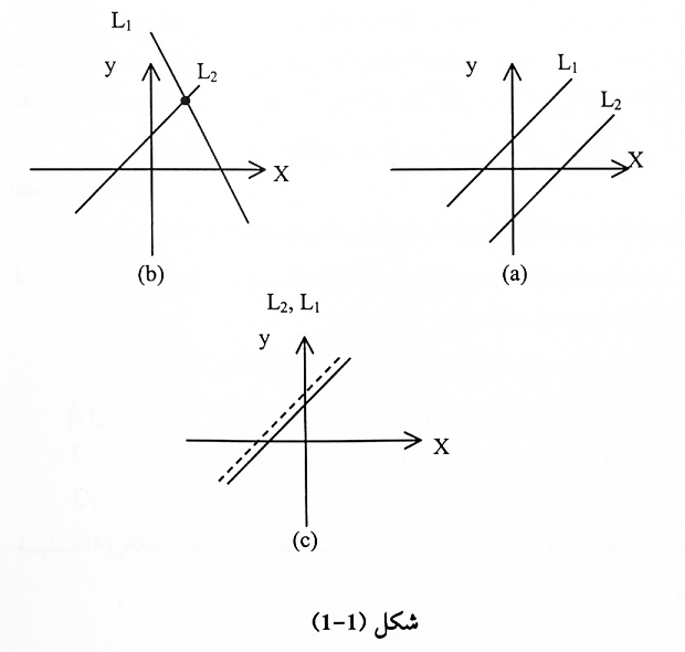 إن الشكل الهندسي لهذه المعادلات هو الخطوط المستقيمة L1 و L2 كما في الشكل (1-1) ولما كانت النقطة (x , y) تقع على المستقيم إذا وفقط إذا كانت x و y تحقق معادلة المستقيم، فإن حلول النظام الخطي تقابل المستقيمين L1 و L2 كما موضح في الشكل (1-1).