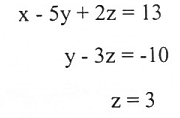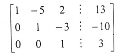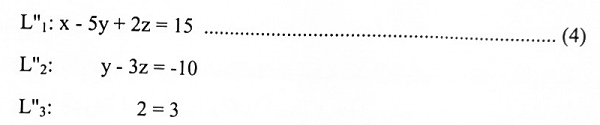 من L''3 نحصل على z = 3 وبتعويضها في L''2 نحصل على y = -1 وأخيراً نعوض عن z,y في L''1 فنحصل على x = 2، أي أن مجموعة الحل هي: (3 ، -1 ، 2) لاحظ أن النظام الخطي (3) يكافئ النظام (1) . ويسمى النظام (3) نظام خطي بالصيغة المدرجة صفياً.