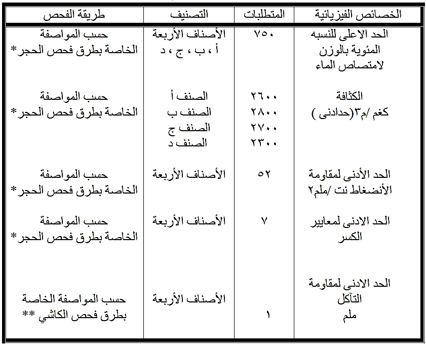 تطابق خواص الرخام المتطلبات الواردة في المواصفة القياسية العراقية رقم (1387/1989) وكما في الجدول رقم 5-12) .