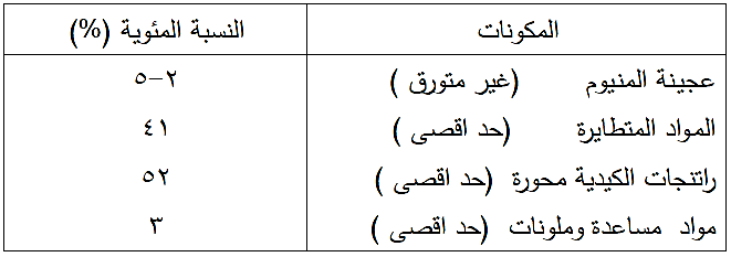 يتكون الطلاء من خليط معجون الالمنيوم ( غير المتورق) وراتنجات الكيدية محورة ومذيبات اورماتية ، ومواد مساعدة وملونات ، يبين الجدول رقم (13-1) النسب المئوية للمكونات ، يستعمل لطلي السطوح المعدنية والمطلية سابقا بطلاء اساس مناسب .