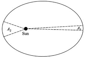Figure 1.2. Kepler’s law of equal areas. The area A1 equals the area A2.