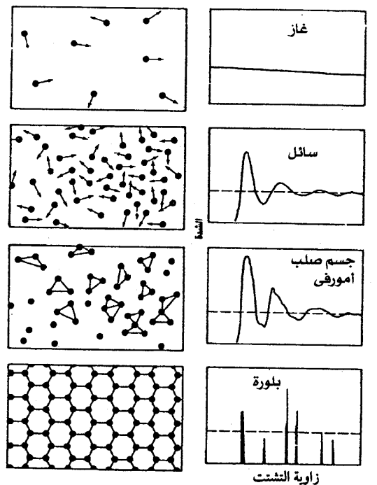 ويوضح الشكل (14-4) بعض نماذج التوزيعات الذرية وأنماط الحيود المتوقعة من كل منها. ويلاحظ أن نمط الحيود من السوائل والجوامد الأمورفية شبيه بالتشتت الانتشاري المعدل ببقايا الترتيب.