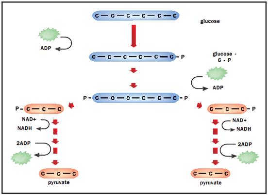 The process of glycolysis. In glycolysis, the six- carbon glucose (shown without its hydrogens or oxygens) is first destabilized by the addition of ATP, and then split. Further transformations create NADH and new ATP, leaving a pair of three- carbon pyruvates.