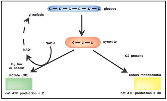 In the absence of oxygen the pyruvate is converted to NAD+ in reactions collectively referred to as fermentations.