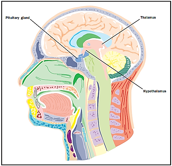 Anatomic location of the hypothalamus, in relation to the thalamus and pituitary gland.