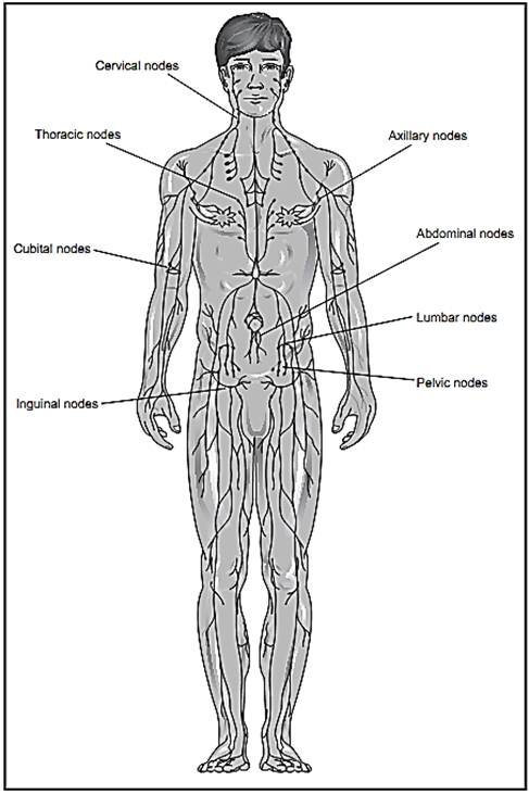 A lymphangiograph of a man, showing cervical, thoracic, cubital, inguinal, axillary, abdominal, lumbar, and pelvic nodes of the lymphatic system.