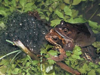 Common frogs in amplexus. Sexually reproducing individuals spend a considerable amount of time and energy locating mates, exchanging genetic material, and often caring for young.