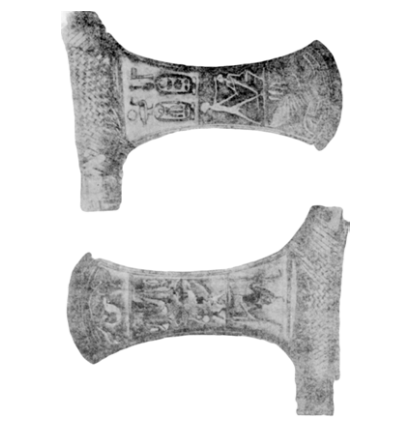 والواقع أن تبادُل الثقافة والصناعة بين البلدين قد ظهر أثره في سلاحين من أسلحة الزينة في نفس العصر الذي نحن بصدده، قد كان يحملها الملك «أحمس»، وكذلك في قطعة أخرى من الحلي باسم «كامس» وُجِدت مع مجوهرات والدته «أعح حتب»، فنجد أنه قد نُقِش على أحد وجهَيْ خنجر «أحمس» المعلَّق في خيط من الذهبِ اسمُ الملك، وكل حرف من حروفه قد غُطِّي بصفيحة من الذهب الجميل الصنع، ثم نجد بعد ذلك أنه قد صيغ على نفس الوجه أسد يقتفي أثرَ ثور، ثم أربع جرادات، ويُرى في صنع هذا الخنجر تأثيرَ الفن الكريتي المحض؛ إذ قد وجد في هذه الجزيرة وفي «مسينا» خناجر مطابقة لخنجر الملك «أحمس»، غير أن الصناعة كانت مصرية، وكذلك نجد نفس التأثير «الكريتي» في (بلطة) «أحمس« (1) (انظر الشكل 1)، يضاف إلى ما سبق أن الفرعون قد أشار إلى البلاد التي تغلَّبَ عليها كما ذكرنا آنفًا. أما علاقة هذا الملك بشعبه، وما يحملونه له من رهبة وتجلة في قلوبهم، وما يحيط به نفسه من الأبهة والعظمة عند خروجه على الناس في المحافل الرسمية، فقد جاء وصف كل ذلك في قطعة رائعة ربما تذكِّرنا بعهد ملوك الدولة العباسية، وما كانت تُوصَف به مواكبهم، وكذلك ينطبق على سلاطين المماليك، وما كانوا يحيطون به أنفسهم من مظاهر الملك الرائعة، فاستمع إلى هذه الفقرة التي لم نجد لها مثيلًا في النقوش المصرية التي طبقت هذا العصر، ولم نقرأ ما يشابهها في العصور التي تلت: «ويطلع الملك وحاشيته كأنه القمر في وسط النجوم، ويسير في رفقٍ وبخطًى وئيدة، وبقدم ثابتة، ونعل ينطبع على الثرى أثره، ويرفرف عليه بهاء «رع»، ويحميه «آمون» والده الفاخر، مفسحًا له الطريق، والقطران يقولان: حقًّا إنَّا نراه، وحبه يغمر كل إنسان، وتنبهر العينان لرؤية هذا الملك، والقلوب تخفق له، وتنظر إليه كأنه «رع» عند إشراقه … إلخ«.