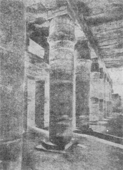 وهذا المعبد العظيم الذي سردنا ذكره ممَّا بقي في اللوحة التي نقشت عنه، لا يزال قائمًا حتى الآن، ويحتوي على قاعة رئيسة فسيحة الأرجاء يرتكز سقفها على صفين من العمد، يشتمل كلٌّ منهما على عشرة عمد ذات تيجان غريبة تمثِّل في الواقع عشرة محاور ارتكازية لسرادق؛ ولذلك يجد المتأمِّل في القاعة أنها تمثِّل خيمة عظيمة، وتحقيقًا لهذه الفكرة أُقِيم دهليز منخفض السقف حول جوانب القاعة مماثِل للهدب المرفوعة على جوانب الخيمة، ومن المحتمل جدًّا أن هذا الطراز الفذ من المباني كان يقصد به «تحتمس الثالث» أن يُبرِز به في صراحة صفات الفرعون الحربية، وأن يُبرِز اعتقادَه بأن الإله «آمون» إله حرب من جهة أخرى، وأنه إنما يأوي إلى معسكر في سرادق مثل هذا لا إلى بيت أو محراب على غرار الآلهة الآخرين. وفي جوانب هذه القاعة وخلفها أُقِيمت حجرات عدة كما أُقِيمت أمام المعبد في الجهة الغربية ردهة مكشوفة تفصل بين هذا المعبد ومعبد الإله آمون الأصلي، (2) وهذا المعبد يُعرَف بقاعة الأعياد، ويُعَدُّ بحقٍّ من أجمل المباني في طيبة، ويبلغ طول القاعة العظمى التي وصفناها نحو 140 قدمًا، وخلفها يقع المحراب أو قدس الأقداس.
