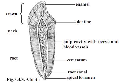 Each tooth consists of three regions. These are the upper crown, middle neck and basal root regions. The crown region has one or more cusps. The tooth is made up of a calcified tissue called dentine.