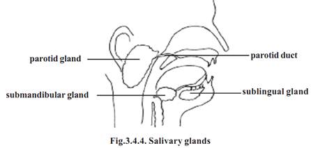 Salivary glands: These are scattered throughout the oral cavity. Three pairs of glands are larger. They are the parotid, submandibular and sublingual glands. The Parotid glands are the largest. They are located just anterior to