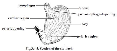 Stomach: It is an enlarged sac like structure. This sac found in the upper part of the abdomen is horizontally placed. It is divisible into two regions namely cardiac and pyloric stomachs. The cardiac stomach is towards the left of the abdomen. The oesophagus opens into the cardiac stomach through the gastroesophageal or cardiac opening. A part of the stomach to the left of the cardiac region is the fundus. The largest part of the stomach is the body. The body narrows to form the pyloric region. The pyloric opening between the pylorus and intestine is surrounded by a ring of muscles called the pyloric sphincter.