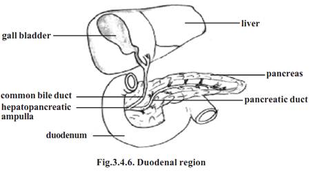 Duodenum - It is about 25 cm. long. It curves within the abdominal cavity and completes nearly 180 degree arc. Liver and pancreas are associated with the duodenum.