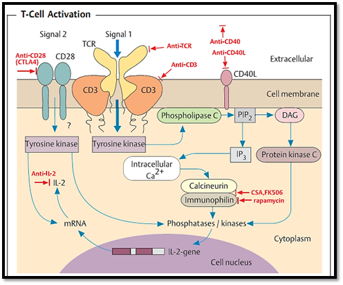 Fig. 1 Regulation of T-cell activation is controlled by multiple signals, including costimulatory signals (Signal 2). Stimulation of the T cell via the T-cell receptor (TCR; Signal 1) activates a tyrosine kinase, which in turn activates phospholipase C (PLC). PLC splits phosphatidylinositol bisphosphate (PIP2) into inositol trispho- sphate (IP3) and diacyl glycerol (DAG). IP3 releases Ca2+ from intracellular depots, whilst DAG activates protein kinase C (PKC). Together, Ca2+ and PKC induce and activate the phosphoproteins required for IL-2 gene transcription within the cell nucleus. Stimulation of a T cell via the TCR alone results in production of only very small amounts of IL-2. Increased IL-2 production often requires additional signals (costimulation, e.g., via CD28). Costimulation via CD28 activates tyrosine kinases, which both sustain the transcription process and ensure post-transcriptional stabilization of IL-2 mRNA. Immunosuppressive substances (in red letters) include cytostatic drugs, anti-TCR, anti-CD3, anti-CD28 (CTLA4), anti-CD40, cyclosporine A and FK506 (which interferes with immunophilin-calcineurin binding, thus reducing IL-2 production), and rapamycin (which binds to, and blocks, immunophilin and hardly reduces IL-2 at all). Anti-interleukins (especially anti-IL-2, or a combination of anti-IL-2 receptor and anti-IL-15) block T-cell proliferation.