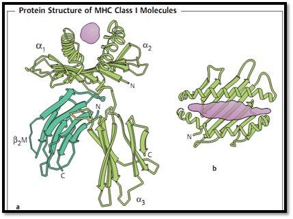 Fig. 3 MHC class I translation antigen: a lateral view, b vertical view. The presenting peptide is shown in violet. The three domains of the heavy chain are a1, a2 and a3. b2 microglobulin (b2M) functions as a light chain, and is not covalently bound to the heavy chain.