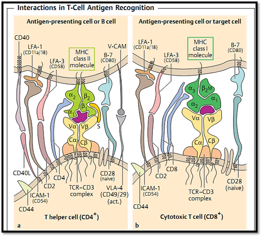 In order to recognize the presented antigen, T cells require the specific T-cell receptor and a molecule which functions to recognize the appropriate MHC molecules (i.e. CD4 or CD8 which recognize MHC class II and MHC class I, respectively). Thus T cells are classified into different subpopulations based on the CD4 or CD8 surface molecules: