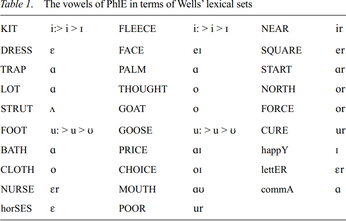Table 1 summarizes the vowels of PhlE in terms of Wells’ lexical sets.