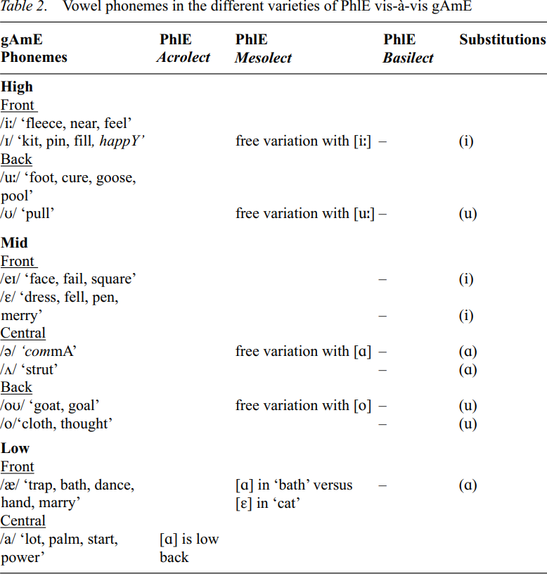 Since there is considerable lectal variation further details are provided in Table 2, of the three PhlE varieties alongside those of gAmE. In table 2 a minus sign (-) represents a set present in gAmE but absent in the PhlE variety. Substitutions made for those absent phonemes are enclosed in parenthesis in the last column of the tables. As the U.S. phonological tradition generally classes /eɪ/ and /oʊ/ with the monophthongs, I have left them in table 2, whilst excluding the other diphthongs.