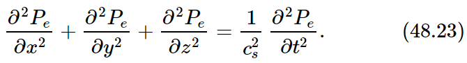 That this is true can be verified by substituting in ei(ωt−k⋅r). Clearly, every time we differentiate with respect to x, we multiply by −ikx. If we differentiate twice, it is equivalent to multiplying by −k2x, so the first term would become −k2xPe, for that wave. Similarly, the second term becomes −k2yPe, and the third term becomes −k2zPe. On the right, we get −(ω2/c2s)Pe. Then, if we take away the Pe’s and change the sign, we see that the relationship between k and ω is the one that we want.