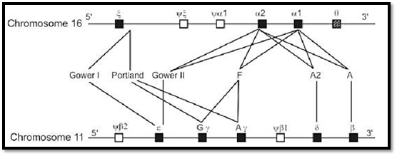 1- α globin gene family: The a gene cluster lies on chromosome 16 (Fig. 3). It contains two genes for the a-globin chain, the o gene that is expressed early in development as a component of embryonic hemoglobin, and a number of globin like genes that are not expressed (pseudogenes). The a chain has 141 amino acids.