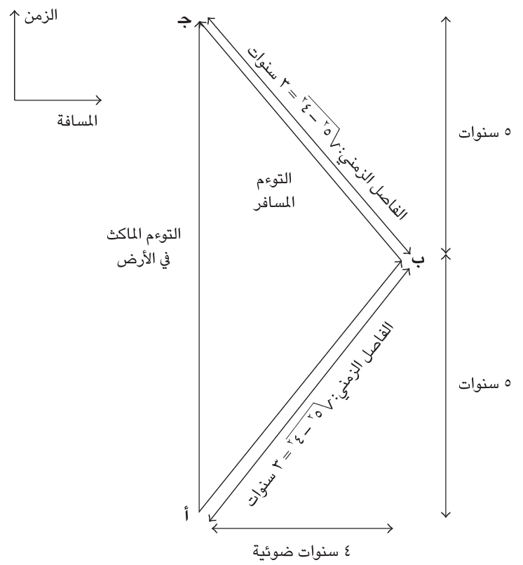 يمكننا أن نزيد على ذلك بالفعل ونستخدم تعريف الفاصل الزمني لحساب الفرق الفعلي. فالفاصل من النقطة «أ» إلى النقطة «جـ» – بالسنوات – يساوي الجذر التربيعي لـ (102 – 02)، أي 10 فقط، ومثلما نتوقَّع، فإنَّ التوءم الماكث في الأرض ينتظر عشر سنوات. أما الفاصل الزمني من النقطة «أ» إلى النقطة «ب» فهو الجذر التربيعي لـ (52 – 42) أي 3؛ فلم يمرَّ على التوءم المسافر سوى ثلاث سنوات قبل أن يبدأ رحلة العودة. وبالتناظر، فإن الفاصل الزمني من النقطة «ب» إلى النقطة «جـ» هو أيضًا 3؛ ومن ثمَّ فإن إجمالي الوقت الذي قاسه التوءم المتحرك يساوي ست سنوات؛ أي إن سرعة مرور الوقت للتوءم المتحرّك بلغت 60 بالمائة فقط من سرعة مروره للتوءم الثابت.