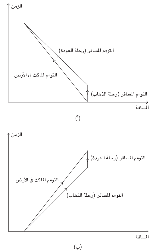 إذن، توصف مفارقة التوءم في إطار الذهاب كما يلي: تبطئ ساعة التوءم الماكث في الأرض مقارنة بالساعة الثابتة. لا تبطئ ساعة التوءم المتحرك في البداية، لكنها بعد نقطة العودة، تبطئ بدرجة أكبر من ساعة التوءم الماكث في الأرض، حتى إنَّ التوءم المتحرك يسجل زمنًا إجماليًّا أقل مما يسجله التوءم الماكث في الأرض. وعلى النقيض من ذلك، في إطار العودة (الشكل 3-4 (ب))، فإن ساعة التوءم المتحرّك تبطئ في البداية للغاية مقارنةً بالساعة الثابتة، ثم تتقدم بسرعتها العادية، بينما تتقدم ساعة التوءم الماكث في الأرض ببطء نوعا ما على مدار الوقت بأكمله. في كلٌّ من هذه الحالات، يكون لدينا تفسير فيزيائي ديناميكي لقياسات الزمن المتباينة لدى التوءمين، من حيث تأثير الحركة في العمليات الفيزيائية، لكن هذا التفسير مُختلف في كل إطار قصوري.