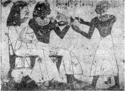 يضاف إلى ذلك أن قميص صاحب المقبرة الأول وثوبه قد غُيرا، وليس في هذا ما يدهش؛ لأن ملابس الرجال في ذلك العهد كانت قد غُيرت بعض الشيء أيضًا. فإذا وازنا بين الثوب الذي كان يرتديه «تحوتي»، والثوب الذي كان يرتديه «تحوتي محب» وجدنا أن ثوب الأخير كان يظهر فيه بعض الانحناء والاتساع من عند الركبة، ولم يقتصر هذا التغيير على صور الأشخاص البارزين، بل نجده ظاهرًا كذلك في جلباب ابن صاحب المقبرة (pl. XI. B). المرسوم على الجدار الشرقي، كما نجد تغييرًا في الأزهار التي كان يقدمها لوالده (راجع pl. Xi b, XII b.).(انظر الصورة (2)، فنلحظ أن هناك تغييرًا في كلتا الحالتين عن الملابس الأصلية التي نشاهدها في مناظر «تحوتي» الأصلية، فثوب الخادم قد زيد في طوله، وأصبح ينتهي بانحناء بعد أن كان يُرسم أفقيًّا. أما ملابس السيدات اللاتي كن يجلسن على الحصير في الوليمة (راجع Wresz I pl. 169) (انظر صورة 3 الوليمة)، فقد وجد المثَّال على ما يظهر مشقة في تغيير صورهنَّ؛ لأن المنظر لم يكن من المناظر المألوفة في عصره؛ ولذلك كان التغيير الذي قام به طفيفًا؛ إذ اقتصر على الزيادة في طول الثوب حتى النحر، وبذلك غطى الثدي الذي لم تستره الحمالة في ثوب زي الأسرة الثامنة عشرة، أما الفتيات اللائي كن يقمن على خدمة هؤلاء السيدات فقد ألبس المثال كلًّا منهن جلبابًا ستر به كل الجسم الذي كان في الأصل عاريًا، وهذا التغيير في صور القبر يعد أهم شيء يسترعي النظر، ويتطلب إيضاحًا شافيًا.