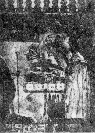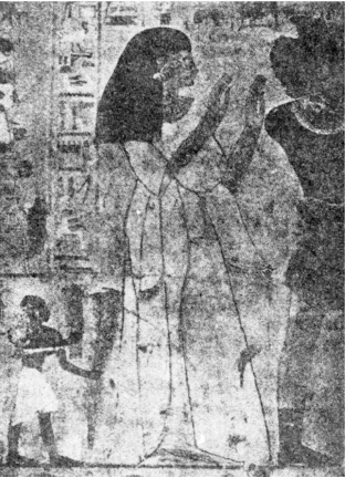 ومن جهة أخرى نشاهد في منظر إحراق القربان (Pi. XII, a.) (انظر الصورة 4) ، وفي نفس الصورة سيدة ترتدي ثوبًا لا يمكن أن يكون من طراز عهد «أمنحتب الثاني»؛ إذ كان ثوبًا واسعًا فضفاضًا عريضًا من أسفله، أسدل على كل جسمها فشمله من الكعب حتى النحر، وقد شدت على صدرها شريطًا عريضًا ينتهي بهدابات منمقة الأطراف قد أرخي على كلا الجانبين، غير أن كل تفاصيل الجسم — وبخاصة الرأس والشعر واليدين — تدل على أن المثَّال الذي أخرجه من عصر الأسرة الثامنة عشرة، في حين أن الملابس كانت من طراز آخر يُنسب إلى الأسرة التاسعة عشرة، وإذا أنعم الإنسان النظر في هيكل هذه الصورة وجد أنه لا فرق بينها وبين صورة والدة «تحوتي» التي تركت بدون تغيير فيها، والواقع أن هذا الثوب الواسع الفضفاض الذي ترتديه قد ألبسها إياه مفتن عصر الرعامسة عندما أراد تغيير الصورة؛ لأنه كان من طراز ملابس السيدات في هذا العصر، وعلى هذا النحو غير مفتن عصر الرعامسة ملابس صورتين أخريين (راجع Ibid pl. XI, b, & d,) (انظر الصورة 2).