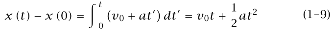 الرسم البياني v مقابل t (شكل 1–8) عبارة عن خط مستقيم ميله a. يمكننا الحصول على علاقة صريحة لـ (t)x عن طريق إدخال هذه العلاقة في المعادلة (3–1) وإجراء التكامل أو – بدون حساب التكامل – عن طريق حساب المساحة المظللة تحت الخط في شكل 1–8 بين 0 = t و t. هندسيًّا (شكل 1–9)، تكون المساحة تحت شكل 1–8 بين 0 = t وt هي العرض t مضروبا في الارتفاع عند نقطة المنتصف وهو