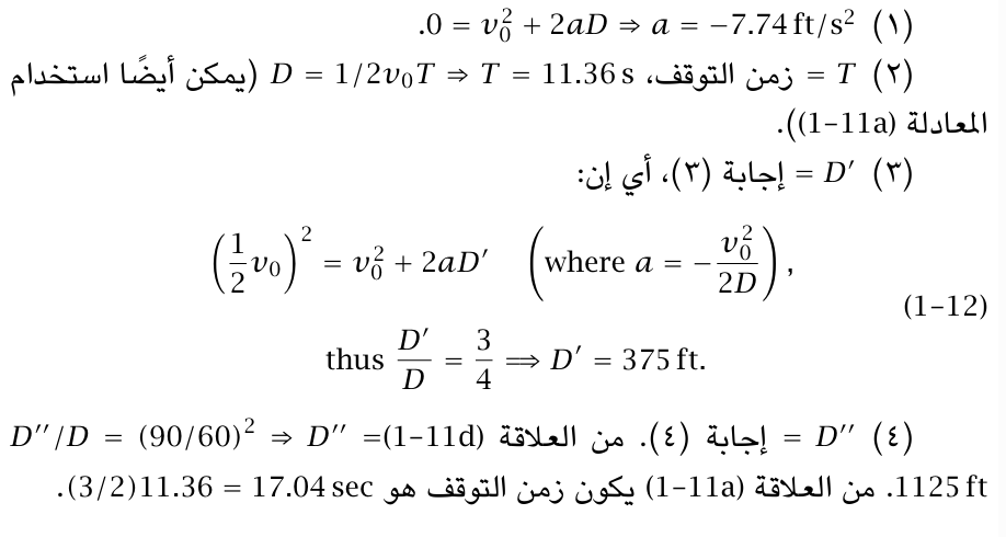 مثال 1–4 (مسألة عجلة ثابتة). تتباطأ سيارة (بعجلة تناقصية ثابتة) م mph 60 إلى السكون خلال مسافة ft 500. [لاحظ أن 60 mph = 88 ft/sec]