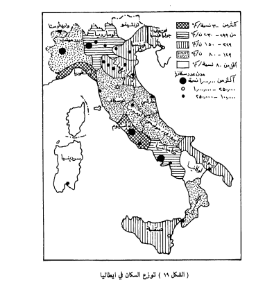 وتحتل صناعة الصلب جانبا هاما في الصناعة الايطالية وانتاجها الحالي يزيد على (23 مليون طن ) تورينو تنتج قرابة الربع ، كما شهدت صناعة بناء السفن تقدما وخاصة في مينائي جنوه ، وتريستا ، والصناعات الكهربائية في ميلانو وتورينو . ولقد برعت ايطاليا بصناعة السيارات الخفيفة والدراجات وتصدر مصانع تورينو وميلانو اعداد ضخمة متزايدة منها كل عام . ولقد اتسعت الصناعات الكيماوية نتيجة غنى ايطاليا بالمواد الخام اللازمة لها وتتركز الصناعات البتروكيماوية في السهل الشمالي وفي جهات اخرى كثيرة. ولصناعة المنسوجات أهمية رئيسية ويشتغل بمصانعها قرابة مليون عامل ، كما تنتج ايطاليا كميات عظيمة من المواد الغذائية (المعلبات ، الحلويات ، الخمور) . وتتميز الصناعة الايطالية عموما بتركيز شديد في السهل الشمالي لكنها لا تتصف بالمجمعات المدنية التي نجدها في حقول الفحم بألمانيا الغربية او بريطانيا . ولقد وصل عدد سكان ايطاليا حسب تقدير عام 1976 الى 56,2 مليون نسمة ، وبذا تبلغ كثافة السكان حوالي 186 نسمة في الكم ، ومعدل الزيادة السكانية قرابة 0٫8٪ ويتكاتف السكان بوجه خاص في المناطق الشمالية من ايطاليا حيث ، ففي كثير من أجزاء سهل لومبارديا تصل كثافة السكان الى 270 نسمة كم وتكون في منطقة ميلانو وسهل ليغوريـا أكثر من 300 نسمة لكل كم ، وتتميز بعض السهول الأخرى كسهل نابولي واقليم مدينة روما بالكثافات السكانية العالية ويعرف القسم الجنوبي من ايطاليا مع جزيرتي صقلية وسردينيـــا بـاسم ميزوجـيـورنـو Mezzogiorono وهو أكثر أجزاء ايطاليا فقرا ، ومتوسط الكثافة فيه لا يزيد عن 150 نسمة / كم وان كان يقل في لوكانيا عن 80 نسمة / كم - كما ان كثافة السكان في أجزائه المنتجة عالية ، اذ تصل في كالابريا الى 150 نسمة في كل كم ، وفي أرض كامبانيا الزراعية يحتشد السكان بنسبة تزيد على 300 نسمة في كل كم وهي ونسبة الزيادة السكانية في الجنوب تبلغ ضعف نسبتها في الشمال ، والامكانيات الصناعية في جنوب ايطاليا محدودة لا تمكنها من امتصاص هذه الاعداد المتزايدة ، ويقل السكان في جبال الألب الايطالية وفي جبال الابنين الوسطى وفي التلال البركانية في اقليم اومبريا ، وكذلك في الهضاب الجيرية وفي هذا فان أقل جهات ايطاليا كثافة في السكان لا تقل عن 50 نسبة مرتفعة لا نجدها في شمال ايطاليا الا في مناطق الحضرنسمة لكل كم وذلك في هضاب شمال سردينيا وفي النطاق الألبي.