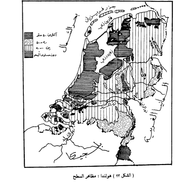 وحدث أيضاً أن ارتفعت الأرض ارتفاعاً طفيفاً ترتب عليه رفع هذه من الطبقات إلى قرب سطح البحر بدرجة كانت كافية لتكوين سلسلة الكثبان عملت كحاجز ضد غارات البحر باستثناء الفترات التي كان يعظم فيها المد . وخلف هذه الكثبان أرسبت الأنهار الكثير من تكوينات الغرين في المياه ، ومن ثم نشأت المستنقعات التي أصبحت أساساً لعمليات الاستصلاح والتي تدعى هناك باسم بولدر - أي أراضي الاستصلاح . وفي الفترة بين القرنين الحادي عشر والخامس عشر استطاعت العواصف العنيفة أن تجتاح الضحلة حاجز الكثبان وتحطمه وفاضت مياه البحر فأغرقت المستنقعات الشمالية ومن ثم تكونت مسطحات مائية ضحلة تعرف باسم فادين زي Wadden Zee) البحر الشمالي ) ، وزويدرزي Zayder Zee ) البحر الجنوبي ) ، كما نشأت الجزر تعرف باسم فريزيان Frisian وقد أمكن استصلاح قسم عظيم سلسلة من هذه المسطحات المائية . ويبذل الهولنديون جهدهم في سبيل صرف المياه من زويدرزي وتحويله إلى أرض يابسة وتتصف مظاهر السطح في هولندا ببساطتها ، حيث لا يزيد ارتفاع غالبية أراضي هولندا عن 50 متراً - هناك جزءاً صغيراً في جنوب مقاطعـة ليمبورج في أقصى الجنوب الشرقي يزيد ارتفاعه عن الرقم السابق - وتقع معظم الأراضي المستصلحة في الغرب تحت منسوب مياه البحر - مطار شبيهول قرب امستردام دون مستوى البحر بـ 4 م ، أما القسم الجنوبي فيقع في منطقة حقول الفحم التي تتاخم هضبة الأردين، وأعلى جزء في البلاد لا يـزيــد ارتفاعه عن 305 متر . وتعتبر أنهار الراين والشيلد والميز الرئيسية التي تجتاز أراضي هولندا ، وهناك العديد من القنوات التي تصل بين مجاري هذه الأنهار ، ويبلغ مجموع أطوال المجاري المائية والقنوات الصالحة للملاحة في هولندا نحو 5600 كيلومتر .