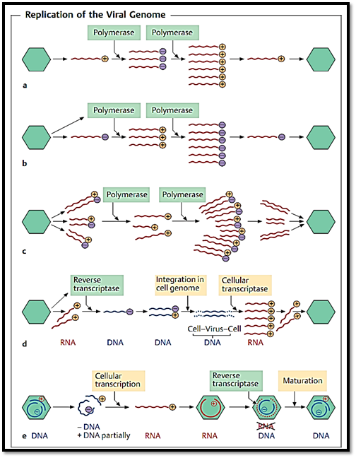 Replication of the nucleic acid. Different processes are observed corresponding to the types and configurations of the viral genome (Fig. 2).