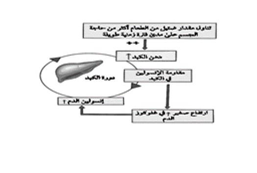 ولكنها واحدة من حقائق الحياة أن الإنسولين يسرع فعليا تحويل الغلوكوز إلى دهن في الكبد.. ولهذا فإن الدورة المؤسفة بأكملها تبدأ مرة أخرى، مؤدية إلى ارتفاع إضافي في مستوى الدهن في الكبد، مع كل التداعيات المؤسفة. يظهر الشكل ادناه كيف ترتبط هذه الأحداث