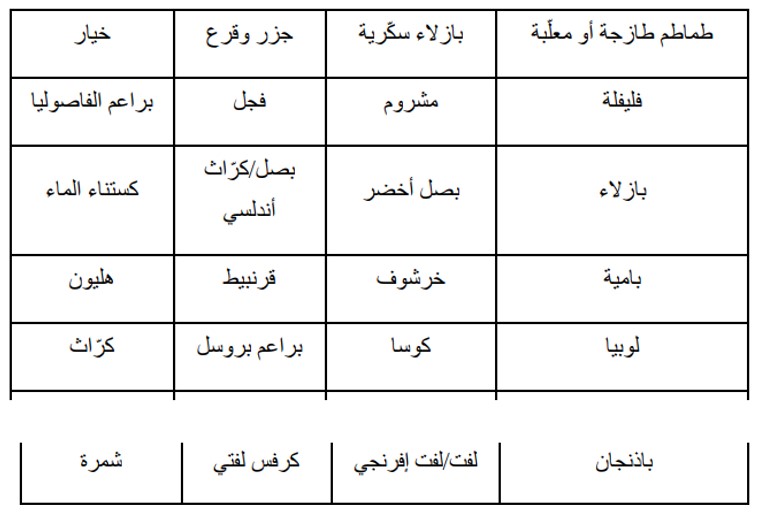 البطاطا، والبطاطا الحلوة، والجزر الأبيض، واليام، وموز الجنة، والمنيهوت، والذرة السكّرية، وجذر الشمندر بسبب احتوائها على مقدار أعلى من النشا. جميع الفاكهة، والمكسّرات والبذور بسبب محتواها العالي جدا من السعرات الحرارية.