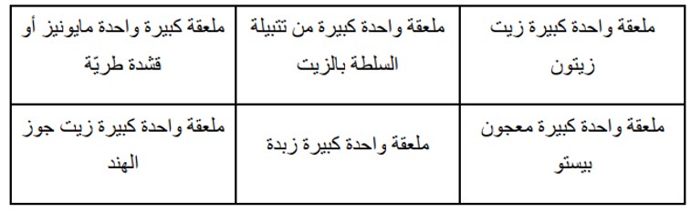 يمكن لمقادير صغيرة من الدهن أن تضيف نكهة وقوامًا لوصفات الخضار. بما أنها عالية في السعرات الحرارية، انتبه لحجم الحصص خلال هذه المرحلة. ليس لأكثر من مرة في اليوم، يمكنك أن تضيف:
