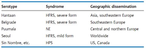 The sources of infection are rodents (mice and rats). The infection is acquired by inhaling aerosols of urine, feces, and animal saliva. In NE and HFRS a renal dysfunction follows the influenza like symptoms. HPS infection results in a rapidly progressive, acute dyspnea with pulmonary edema and is lethal in 60% of cases.