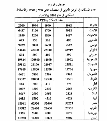 بلغ عدد سكان الوطن العربي عام 1985 (189) مليون نسمة أرتفع الى 222 مليون نسمة عام 1990، واصبح عددهم 251 مليون نسمة عام 1994 ومن المؤمل أن يصل عددهم عام 2020 إلى 700 مليون نسمة.