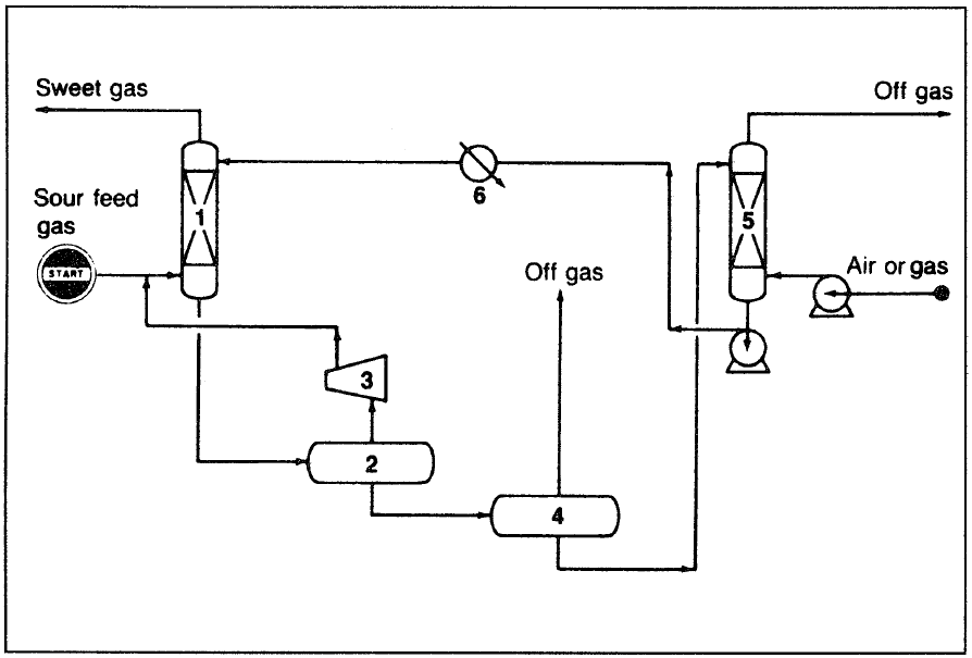 Figure. 1 The Selexol process for acid gas removal:2 (1) absorber, (2) flash drum, (3) compressor, (4) low-pressure drum, (5) stripper, (6) cooler.