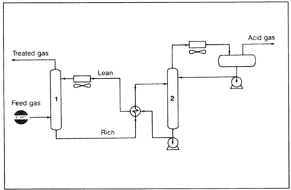 These processes are characterized by a high capability of absorbing large amounts of acid gases. They use a solution of a relatively weak base, such as monoethanolamine. The acid gas forms a weak bond with the base which can be regenerated easily. Mono- and diethanolamines are frequently used for this purpose. The amine concentration normally ranges between 15 and 30%. Natural gas is passed through the amine solution where sulfides, carbonates, and bicarbonates are formed. Diethanolamineis a favored absorbent due to its lower corrosion rate, smaller amine loss potential, fewer utility requirements, and minimal reclaiming needs.3 Diethanolamine also reacts reversibly with 75% of carbonyl sulfides (COS), while the mono- reacts irreversibly with 95% of the COS and forms a degradation product that must be disposed of. Diglycolamine (DGA), is another amine solvent used in the Econamine process (Fig 2).
