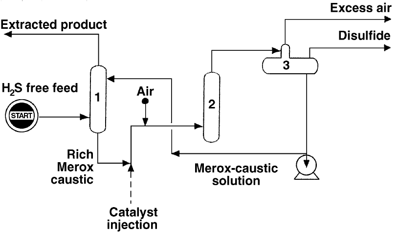 However, a strong caustic solution is used to remove mercaptans from gas and liquid streams. In the Merox Process, for example, a caustic solvent containing a catalyst such as cobalt, which is capable of converting mercaptans (RSH) to caustic insoluble disulfides (RSSR), is used for streams rich in mercaptans after removal of H2S. Air is used to oxidize the mercaptans to disulfides. The caustic solution is then recycled for regeneration. The Merox process (Fig.3) is mainly used for treatment of refinery gas streams.