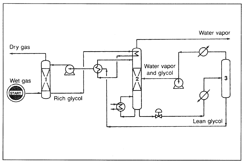 Figure 1 shows the Dehydrate process where EG, DEG, or TEG could be used as an absorbent. One alternative to using bubble-cap trays is structural packing, which improves control of mass transfer. Flow passages direct the gas and liquid flows countercurrent to each other. The use of structural packing in TEG operations has been reviewed by Kean et al2.