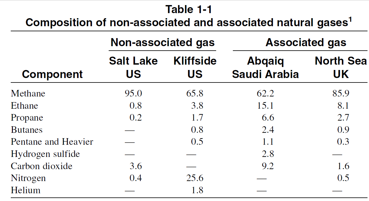 Table 1-1 shows the analyses of some selected non-associated and associated gases.1 In our discussion, both non-associated and associated gases will be referred to as natural gas. However, important differences will be noted. The non-hydrocarbon constituents in natural gas vary appreciably from one gas field to another. Some of these compounds are weak acids, such as hydrogen sulfide and carbon dioxide. Others are inert, such as nitrogen, helium and argon. Some natural gas reservoirs contain enough helium for commercial production.