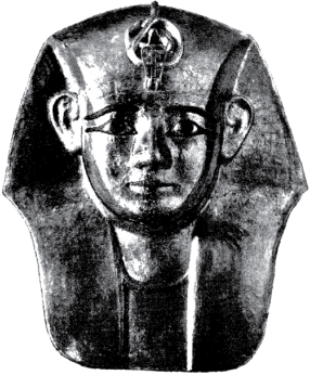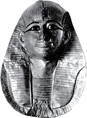 وعلى أية حال، فإن الغطاء الذهبي الذي كان عليها كان سميكًا لم يشوَّه، وبقي حافظًا — بعض الشيء — لهيئته (انظر صورة رقم 1). وهذا الغطاء — عند تصليحه — ظهر بمظهر جميل (انظر صورة رقم 2). وفي التابوت المصنوع من الحجر الرملي لهذا الفرعون لم يمكن معرفة وجود تابوت من الخشب إلا بوجود ثمانية ألواح من البُرْنز مجهزة بمسمارين. ويلاحظ أن الفرعون «أمنمأبت» لم يعمل قرابًا لموميته كما فعل «بسوسنس»، بل اكتفى بعمل قناع من الذهب يغطي من الرأس حتى الصدر، وقد أصاب هذا القناعَ بعضُ العطب؛ إذ التوى وتجعَّد بسبب التلف الذي حدث في التابوت الخشبي ببطء، هذا إلى نقل التابوت من مكان إلى مكان، وقد كان ذلك كله سببًا في أنه جعل القناع يظهر بمظهر قبيح، غير أن مُفْتَنِّي «المتحف المصري» أعادوا له بهاءه الأصلي (انظر صورة رقم 3).