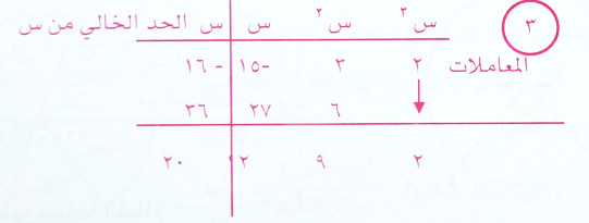 وبما ان المقسوم عليه هو س-3 فإن أ = 3 وان درجة المقسوم هي الثالثة فدرجة خارج القسمة هو الثانية فنرتب العملية على الشكل .