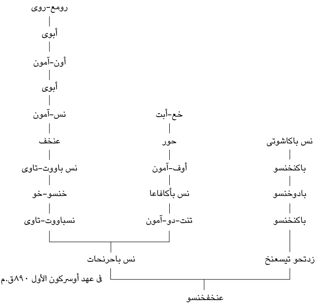 وخلاصة القول إنه من عهد «رومع-روي» حتى عهد «عنخف-خنسو» يوجد أحد عشر جيلًا، فإذا حسبنا الوقت الذي انقضى بين عهد «سيتي الثاني» و«أوسركون الأول»، وجدنا أننا نعرف تاريخ أخلاف «رومع-روي» خلال ما يقرب من ثلاثة قرون، وهو بالضبط الفترة التي بين حكم «سيتي الثاني» و«أوسركون الأول» (أي حوالي 1200ق.م إلى 980ق.م).