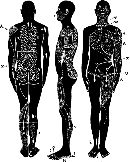 وفي حالة امرأة عجوز بدا هزالها بصورة كبيرة، وتدل حالتها العامة على أنها كانت قد لازمت الفراش مدة طويلة، نجد أنها تكشف لنا عن حالة غريبة، وذلك أنه وجدت جراح في جسمها حدثت قبل مماتها — ربما كان سببها من السرير — على الظهر بين الكتفين، وعلى الأَلْيَتَيْنِ، وهذه الفتحات المتسببة عن النوم قد استُعملت لحشو الظهر بوساطتها، ثم رقعت بقطع مربعة من الجلد الرفيع، ويحتمل أنه كان جلد غزال، وهذه الرقعات خِيطت في الجلد السليم البعيد من الجزء الممزق، وقد غطيت غرز الخياطة بقطع من نسيج الكتان المدهون بالقطران، وكذلك نجد أن خُرَّاجًا كبيرًا حدث في الجزء الذي بين عضو التناسل والمستقيم، وقد سُدَّ وخِيطَ بخيط، هذا إلى قرحة على إحدى الساقين قد غطيت برقعة من الكتان المغموس في القطران (راجع Royal Mummies, Fig. 37)، وقد كان القلب دائمًا يُتْرَكُ بعناية في مكانه الأصلي (إلا إذا كان بطريق الصدفة قد قُطِعَ من يد محنط غير ماهر في عمله) متصلًا بأوعيته الدموية (راجع Ibid Fig. 38)، أما الأحشاء الأخرى فكانت تُلَف في أربع حزم منفردة كل منها معها صورة من الشمع تمثل الحارس الخاص بها وتوضع في جوف الجسم ثانية (راجع Ibid Fig. 39).