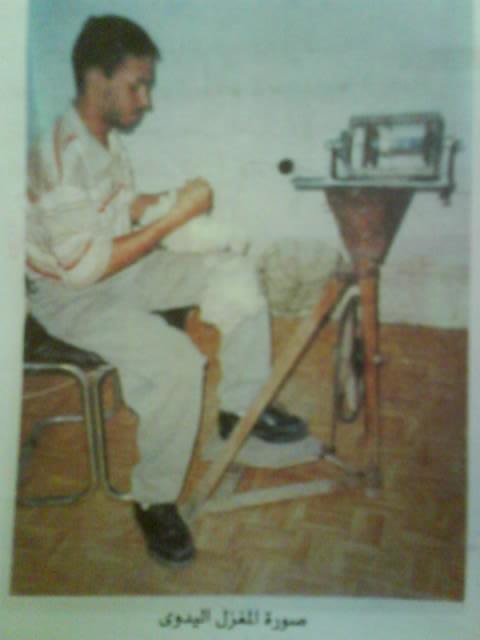 يتم غزل العادم بعد نفشه على المغزل اليدوي.
