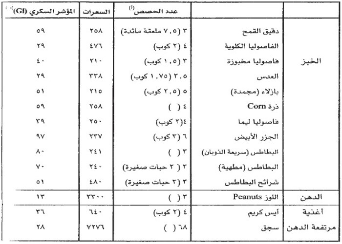 (أ) عدد الحصص التي تزود الجسم بحوالي 50 جراماً كربوهيدرات.